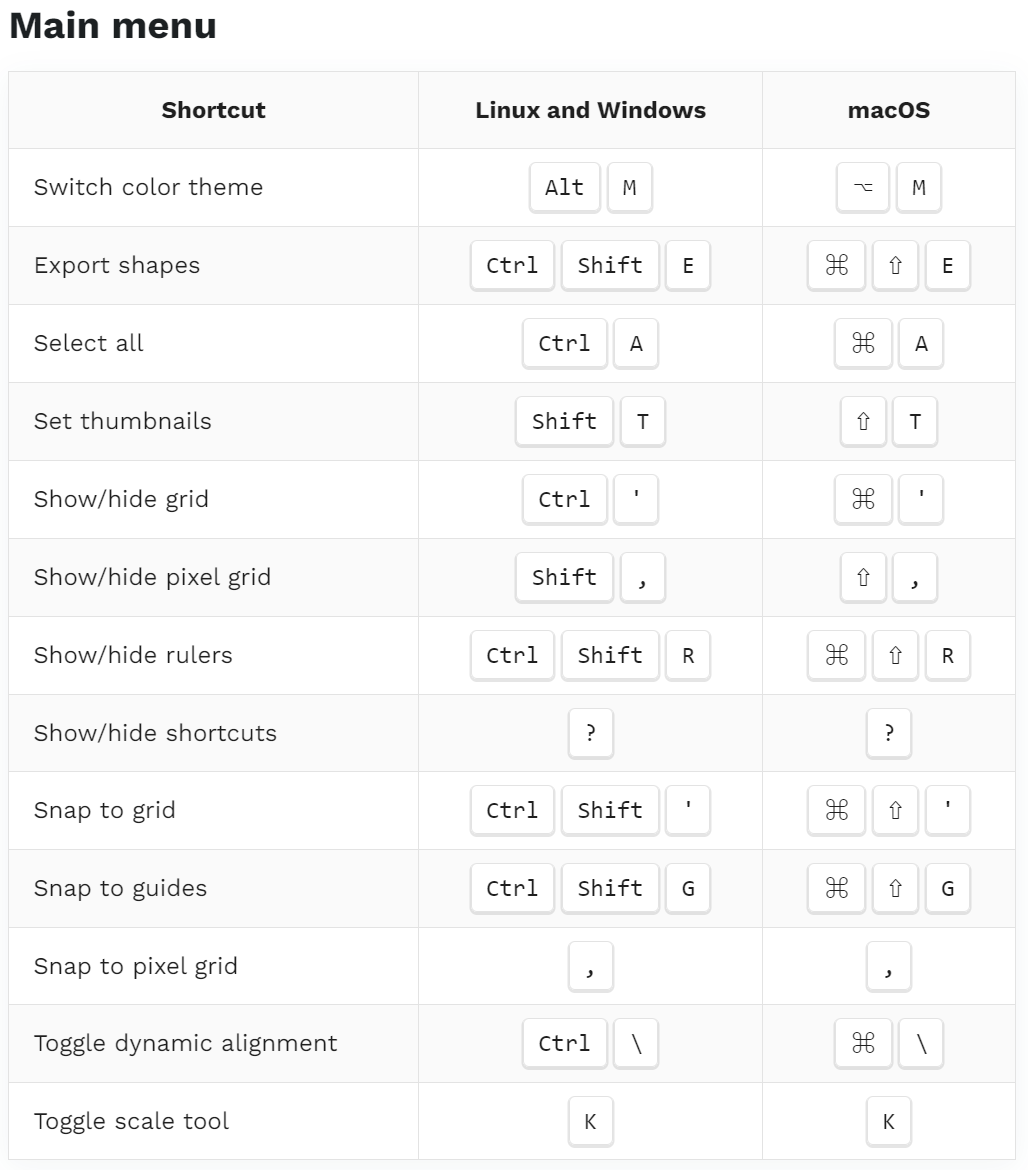 Export shapes | CtrlShiftE | ⌘⇧E |